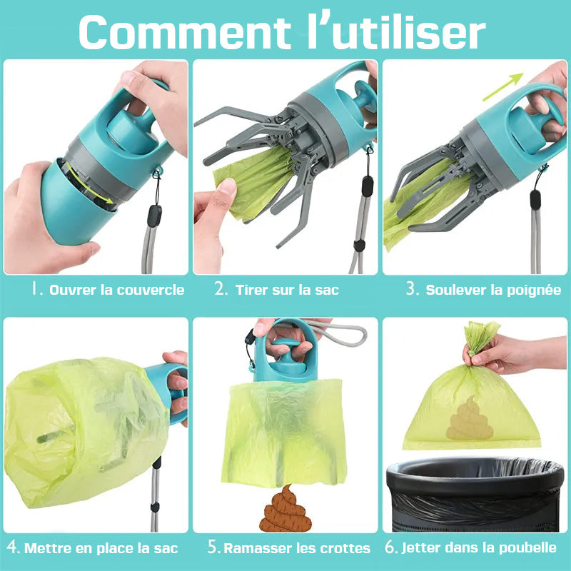 Conçu pour être portatif, le cordon installé dessus est très pratique. Vous pourrez l'accrocher sur votre porte ceinture, sur votre sac, ou bien sur la laisse même de votre chien. Pour l'utiliser, vous n'aurez qu'à suivre les étapes en commençant par retirer le couvercle, puis tirer sur le sac, soulever la poignée, mettre en place la sac et enfin ramasser les crottes et jeter dans la poubelle.