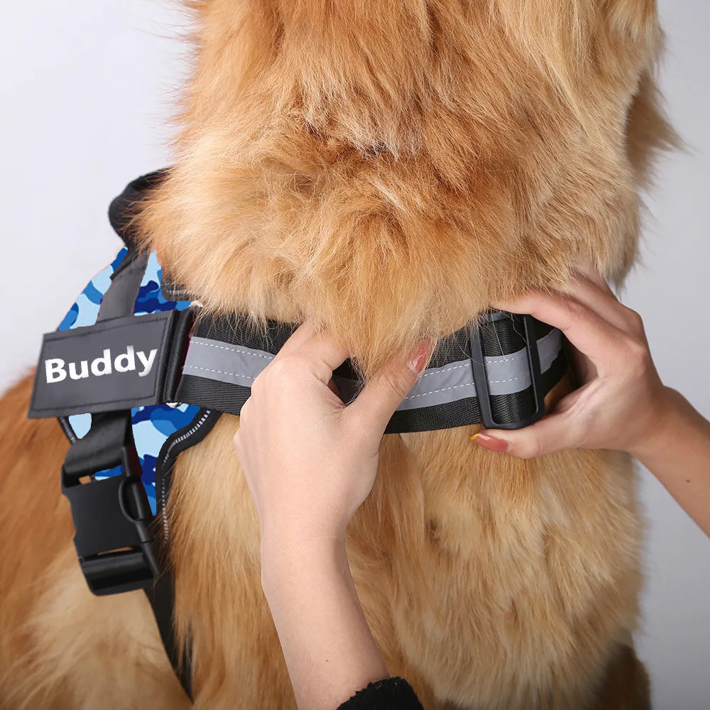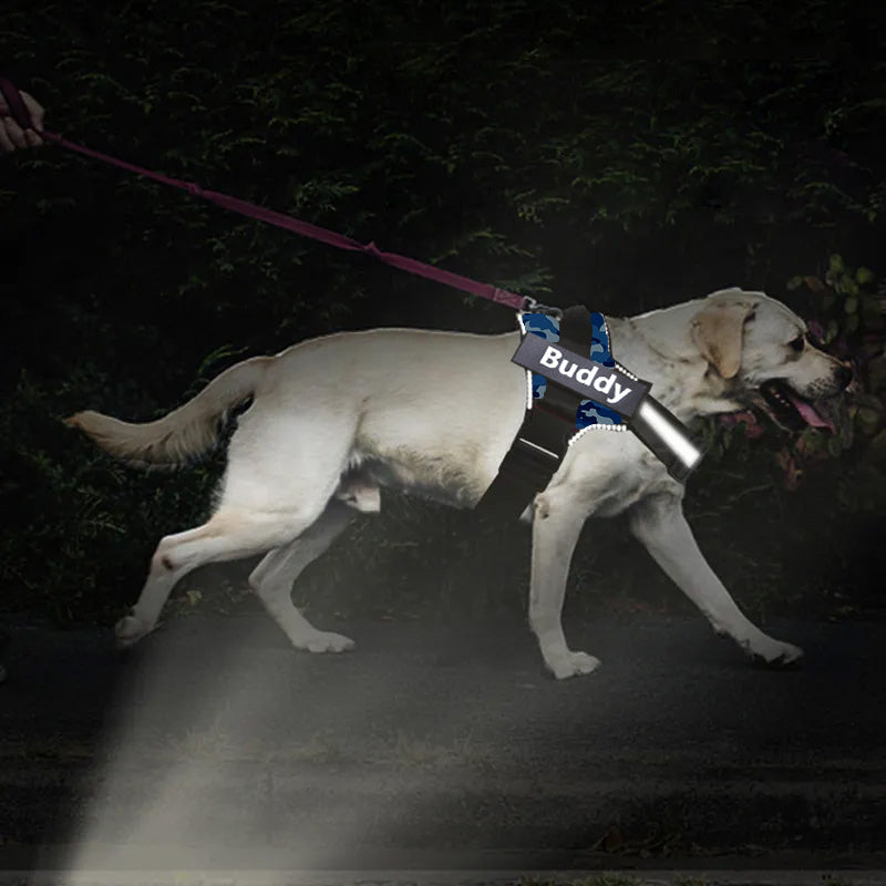 Chacun a souvent ses habitudes et son emploi du temps. Avec notre harnais personnalisé pour chien, même faire la promenade nocturne devient plus sécuritaire grâce aux bandes réfléchissantes sur la sangle. Une fois exposée à une source de lumière, la bande se met à briller pour faire signe aux conducteurs ou toute autre personne votre présence afin d'éviter un accident. De plus, le serrage est ajustable pour une bonne mise en place et le confort du chien.